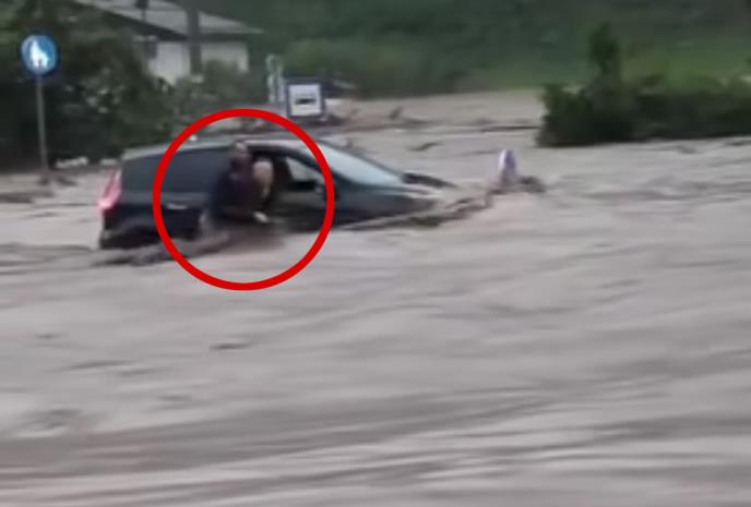 Dramatična scena zabeležena je i u mestu Poljana na severu zemlje gde je potopljen put, a bujica bila toliko jaka da je jednom trenutku odnela automobil u kome se nalazila žena.