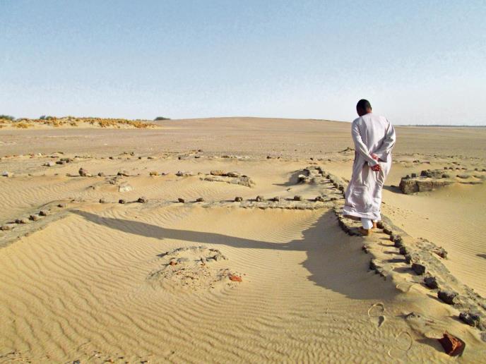 U ram Nila i palmi uokvireno je brdašce na kojem su se ugnezdila nalazišta. Auto juri po pustinjskoj peščanoj trasi. Na jednom mestu začuđuju tragovi guma između kojih su otisci čovečjih stopala - i tako kilometrima! Vijugaju duboko usekli tragovi kao ostaci džinovskih zmija.