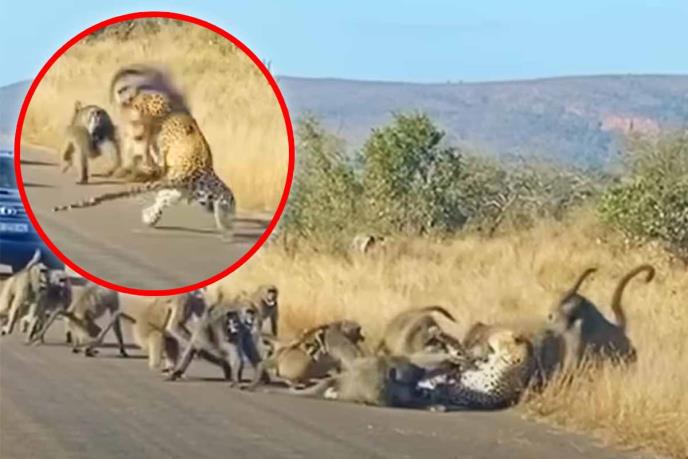 Pokušaj leoparda da uhvati lagani obrok krenuo je po zlu kad se grupa od 50 pavijana udružila i krenula na predatora!