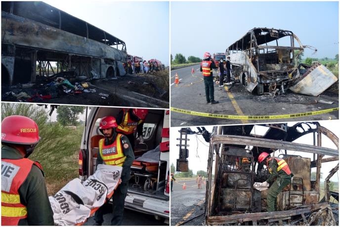 Najmanje 18 osoba je poginulo, a 13 povređeno danas u Pakistanu kada se zapalio autobus koji je udario u kombi parkiran kraj auto-puta.