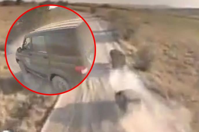 Na snimku se vide dva vozila kako se ubrzano udaljavaju tražeći spas, ali nedugo zatim jedan dron se zabija tačno u vrata vozača jednog od njih.