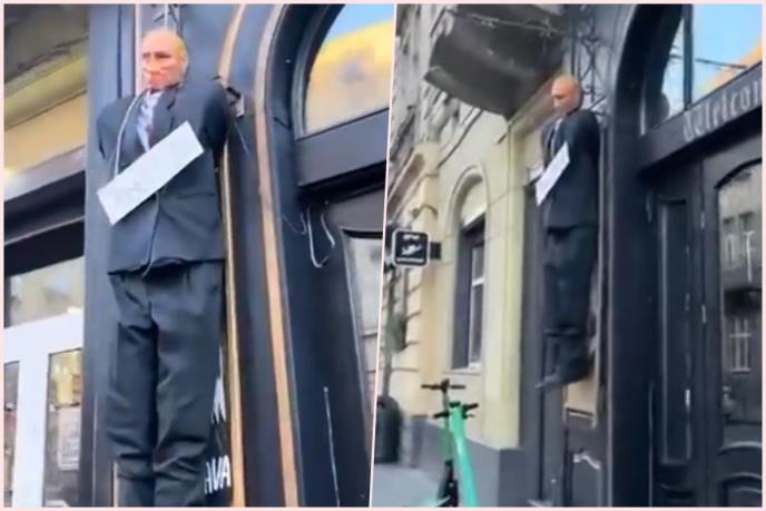 UKRAJINCI "OBESILI" PUTINA USRED GRADA U centru Lavova visi krvava lutka ruskog predsednika (VIDEO)