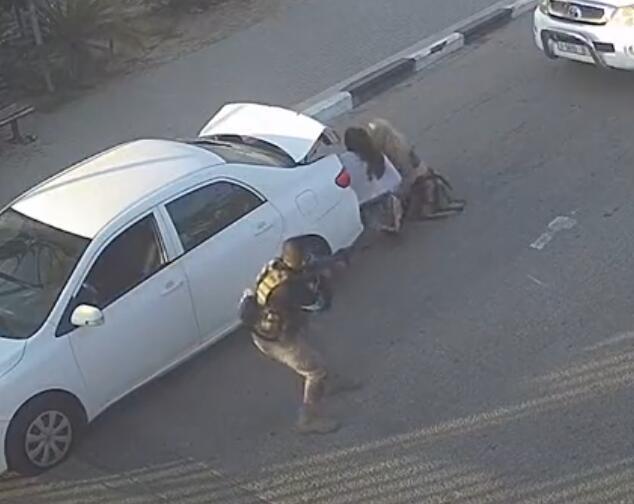 Osam naoružanih Hamasovih terorista iskaču kroz vrata prtljažnika i sam automobil i počinju da jure po zatvorenom kompleksu.