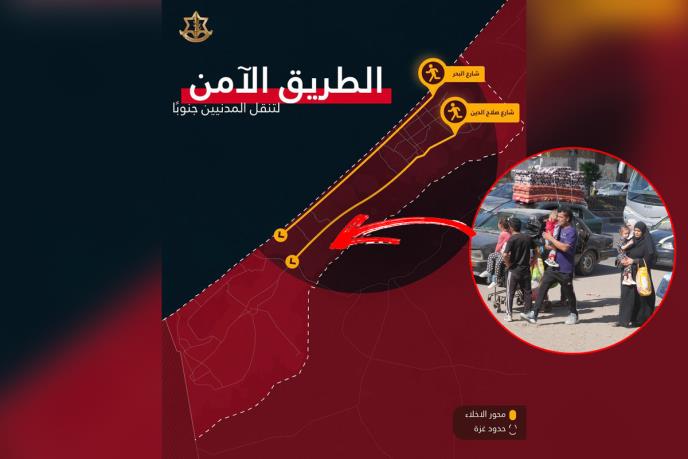 Mapu uz natpis na arapskom, kao i poruku na tom jeziku, objavio je Avičaj Adrae, portparol IDF), objavio je da je civilima u severnom delu Pojasa Gaze izraelska vojska poručila da danas koriste dva puta kada krenu prema jugu te palestinske enklave.