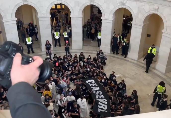 Demonstranti su obučeni u crne majice, na kojima piše "Jevreji kažu obustavite vatru sada" ušli su u zgradu, a policija je počela da hapsi okupljene kako su postajali sve glasniji i počeli da se ponašaju nekontrolisano.