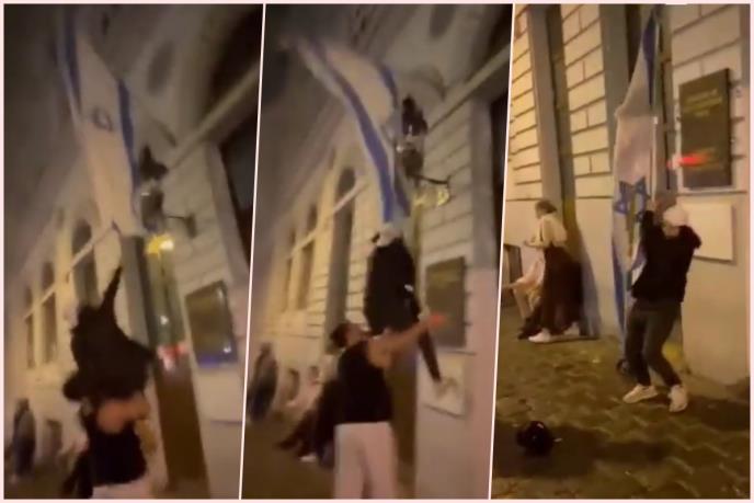 U klipu, koji su objavili i austrijski mediji, vide se dva mlađa muškarca koji iznad ulaznih vrata sinagoge nasilno skidaju izraelsku zastavu.