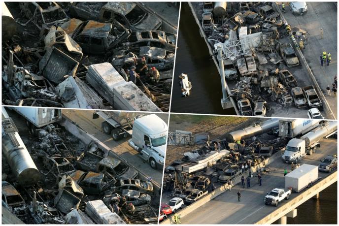 Državna policija Lujzijane je objavila da se lančano sudarilo više od 158 vozila, zbog čega se deo auto-puta zapalio, a uništen je teretni kamion cisterna koji je prenosio "opasnu tečnost".