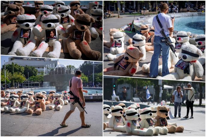 Na svakoj od ovih igračaka nalazi se po jedna fotografija deteta koje su 7. oktobra prilikom upada na jug Izraela iz Pojasa Gaze oteli pripadnici palestinske ekstremističke organizacije Hamas.