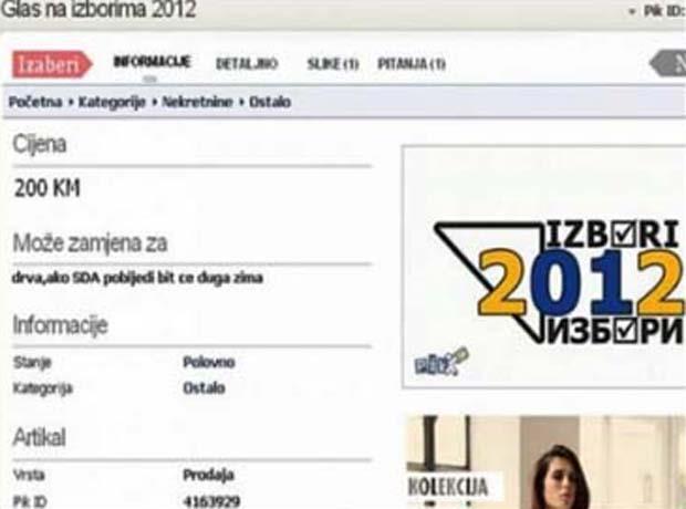 SARAJEVO - Prodajem glas na predstojećim izborima za 200 konvertibilnih maraka, a moguća je i zamena za ogrev za zimu, može se pročitati u neobičnom internet oglasu objavljenom u rubrici Hitno.
