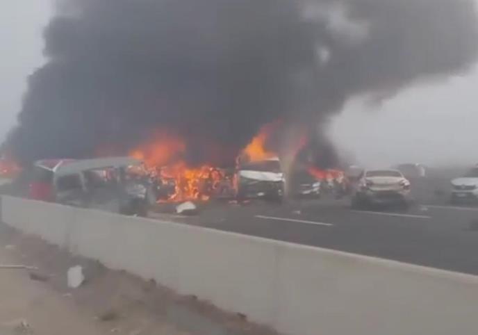 Na jezivim snimcima vidi se nekoliko putničkih i teretnih vozila kako gore nakon velikog lančanog sudara nasred auto-puta dok okupljeni beže. Čuju se i eksplozije.