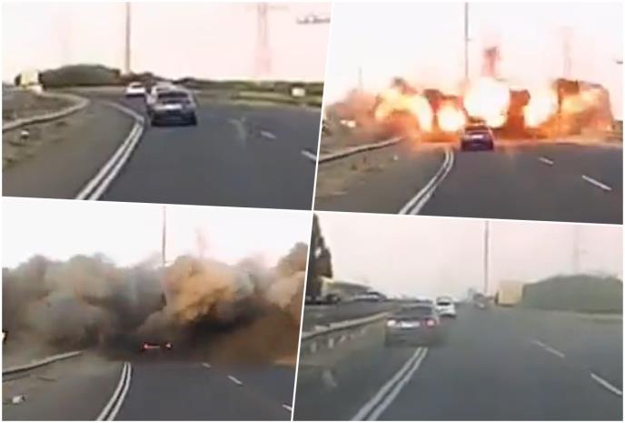 Na snimku se vidi kako raketa doleće i zabija se u kolovoz između automobila u kojem je kamera i vozila koja su odmakla ispred.