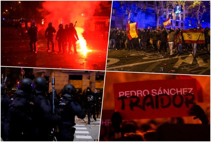 Demonstranti u Madridu su pod državnim zastavama Španije uzvikivali uvrede na račun vršioca dužnosti premijera Pedra Sančesa, a neki ga nazivali "izdajnikom" i "nacistom". Demonstranti su gurali barijere koje je postavila policija s opremom za nerede, a ona odgovorila gumenim mecima i pendrecima.