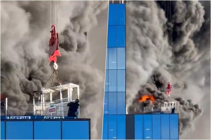 Pre nego što je imao priliku da pokaže svoje spasilačke veštine, snimci pokazuju kako je građevinar ostao sam na vrhu poslovnog kompleksa, dok su mu stopala zahvaćena plamenom. Radnik koristi svoj kaput da privuče spasioca, dok ga gusti oblaci otrovnog dima prekrivaju.