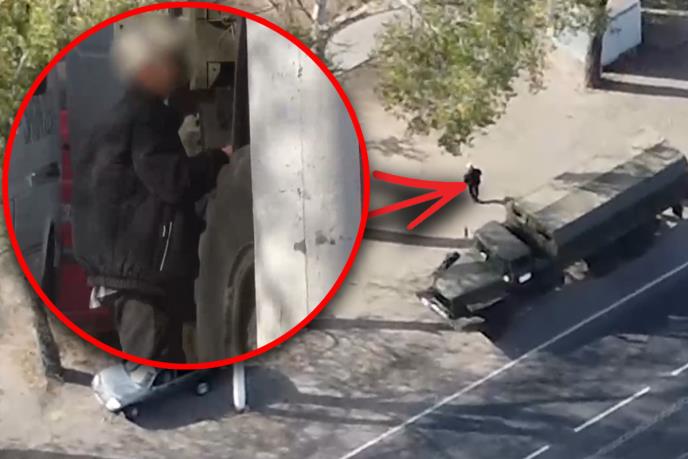 Žena je prema navodima ruskih medija u ponedeljak postavila eksploziv na kamion Oružanih snaga Rusije po nalogu ukrajinskih specijalnih službi. Na snimku se vidi starija žena kako prilazi vojnom kamionu i postavlja improvizovanu eksplozivnu napravu na točak iza kabine.