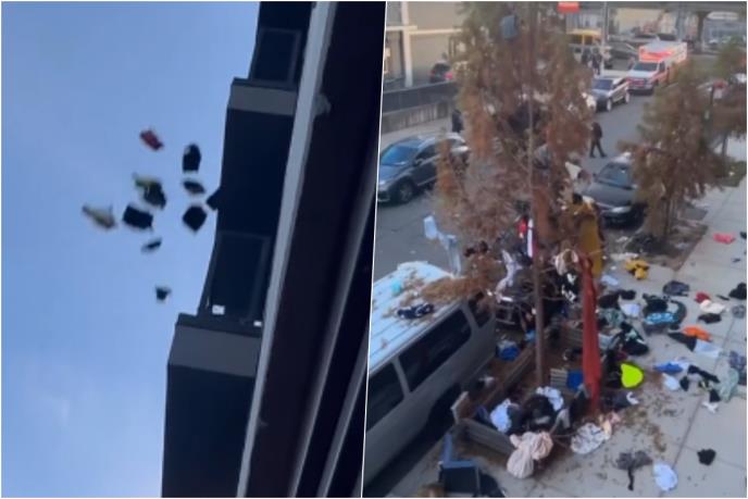 Na kratkom snimku koji je postao hit na društvenim mrežama vidi se žena kako baca odeću i druge stvari na ulicu dok šokirane komšije posmatraju nesvakidašnju scenu na Atlantik aveniji.