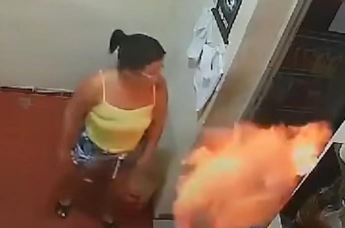 Nadzorna kamera je zabeležila trenutak kad ga šokiranog čoveka najpre polila tečnošću koju je donela u flaši, a potom i zapalila upaljačem.