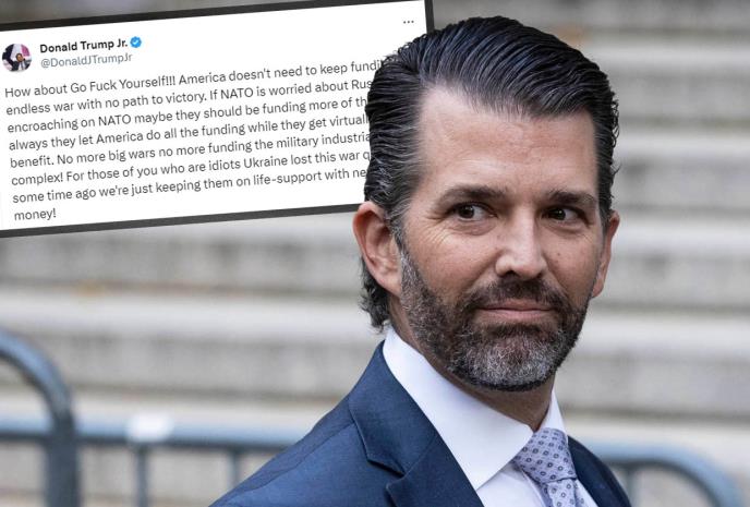 - Šta kažeš da se j*beš! Amerika ne treba da nastavi da finansira beskrajni rat bez puta do pobede. Ako je NATO zabrinut zbog Rusije, možda bi trebalo da više finansira, ali kao i uvek prepuštaju Americi da finansira sve dok dobijaju praktično svu korist. Nema više velikih ratova i nema više finansiranja vojnoindustrijskog kompleksa! Za one od vas koji su idioti, Ukrajina je izgubila ovaj rat pre dosta vremena, mi ih samo držimo na aparatima za održavanje života sa beskrajnim novcem - napisao je Tramp Mlađi.