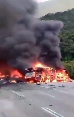 Na snimcima objavljenim na društvenim mrežama vidi se kako je autoput, koji povezuje gradove Guarenas i Karakas, zahvaćen plamenom, kao i izgoreli putnički autobus kako leži okrenut na krovu.