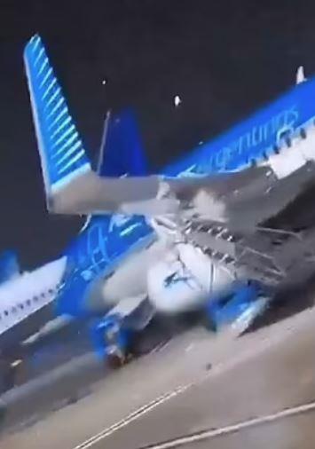 Avion Boing 737-700 kompanije Aerolineas Argentinas je odnesen preko piste prema stepeništu koje su putnici koristili za ukrcavanje, a kasnije se izvrnuo na bočnu stranu.