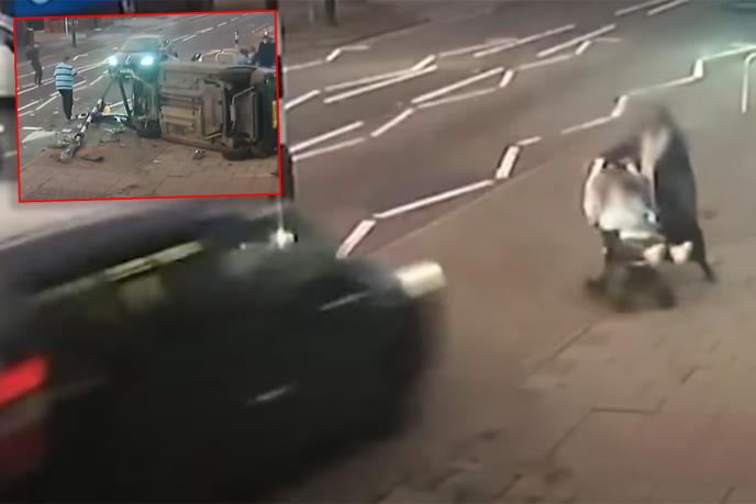 Zastrašujuću scenu, koja se dogodila u subotu oko 16 sati u engleskom gradu Solihalu, zabeležila je nadzorna kamera. Na snimku se vidi kako majka gura dete u kolicima kad auto iznenada izleće sa puta, udara u banderu, a zatim se prevrne na njih.