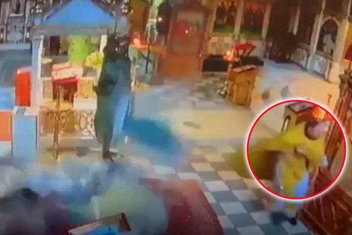 Nadzorna kamera zabeležila je trenutak kad se u petak ujutru plafon obrušava pored pravoslavnog sveštenika u Vaznesenjskoj crkvi u Odesi. Na snimku se vidi kako sveštenik kadi crkvu samo nekoliko sekundi pre nego što se obrušio veliki deo plafona. Nijedna ikona nije oštećena.