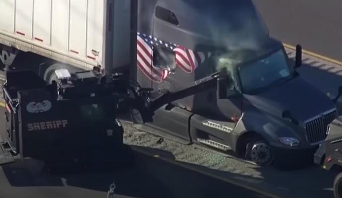 Na šokantnom snimku vidi se trenutak kad je neprobojno vozilo "Top" rastrglo kabinu kamiona sa 18 točkova. Policija je prethodno bila primorana da postavi trake sa šiljcima kako bi izbušila gume na kamionu i primorala vozača da stane.
