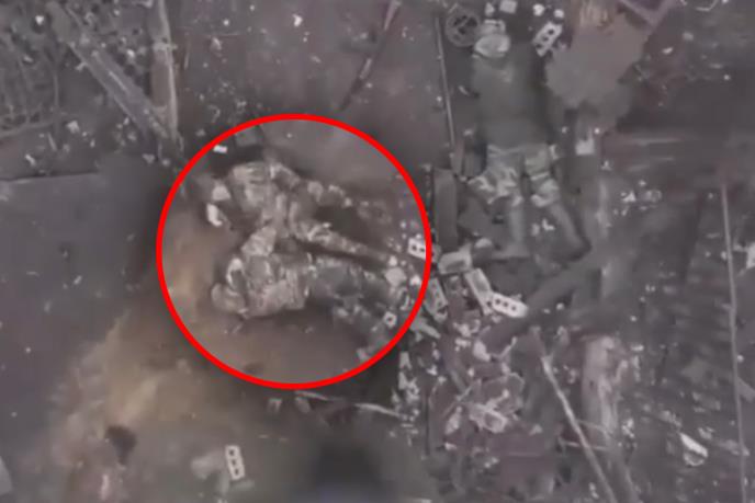 Na snimku koji je zabeležio izviđački dron vidi se ranjeni vojnik koji je okružen telima mrtvih saboraca. Dron se namešta iznad njega i iznenada ispušta granatu, međutim, vojnik očajničkim trzajem uspeva da je šutne dok pada i tako sačuva život.