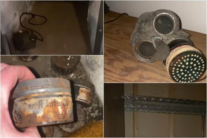 Na snimku se vidi nekoliko starinskih gas-maski, zarđale limenke sa svećama, pumpa za vodu, šest dasaka za spavanje...