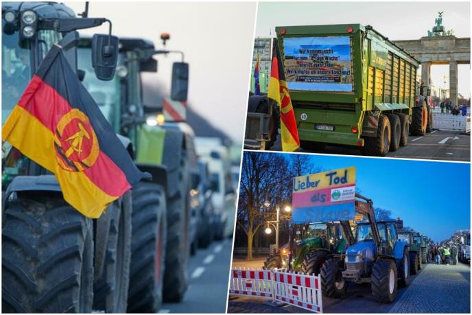Ispred Brandenburške kapije u Berlinu u koloni poljoprivrednih vozila koja je blokira nalaze se i zastave nekadašnje Nemačke Demokratske Republike (DDR).