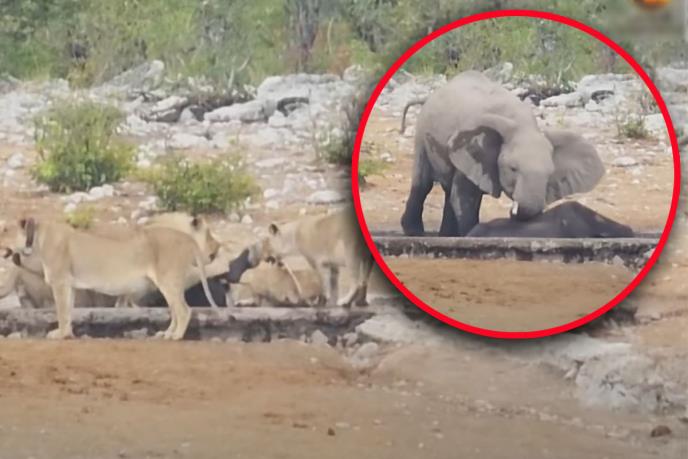 Кrdo slonova videlo je šta se dešava i odmah reagovalo. Naterali su lavove na povlačenje dok je jedan slon očajnički pokušavao da izvuče nosoroga iz vodene rupe. To je trajalo satima i nažalost došlo je do tačke u kojoj slon jednostavno više nije mogao ništa da učini.