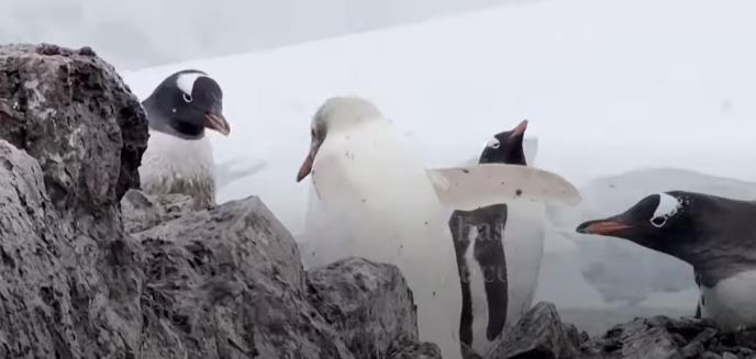 Na nedavno snimljenom snimku, beli pingvin se može videti kako hoda među stotinama pingvina dok jasno štrči.