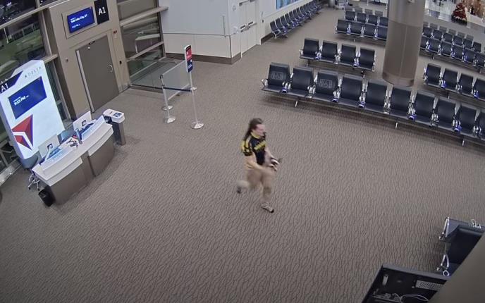Potom razgovara sa radnikom aerodroma, pre nego što se zatrčava na druga zaključana vrata sa namerom da ih razvali. Tu pada na zemlju, ustaje i počinje da udara u staklo cipelama. Nakon toga ga kamere snimaju kako izlazi na vrata za evakuaciju i trči niz stepenice.