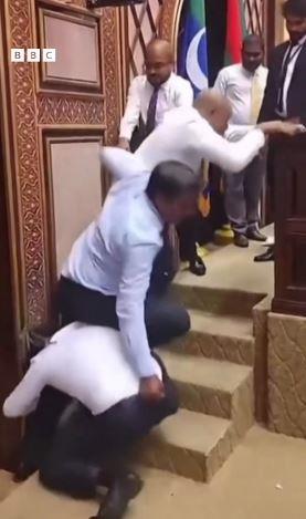 Video snimci iz parlamenta pokazuju poslanika Kandithemu Abdula Šahima Abdul Hakima i poslanika Kendikulhudho Ahmeda Easa kako se sukobljavaju nakon što je Hakim oborio gospodina Easu.