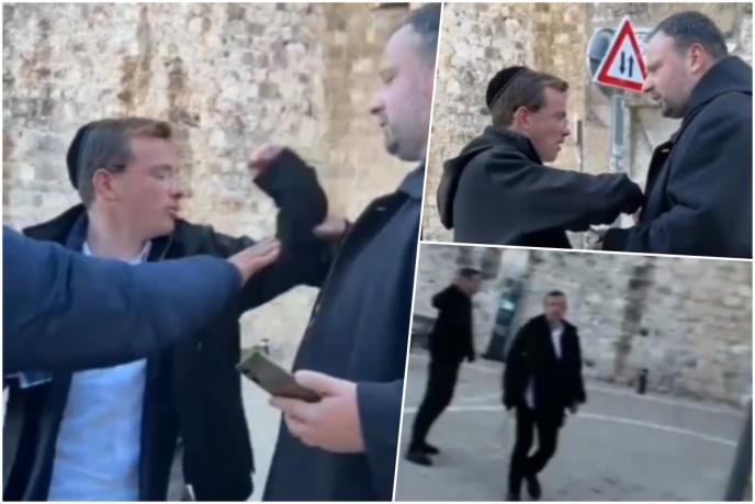 Na snimcima se vidi kako jedan od uhapšenih mladića prilazi u subotu svešteniku Nikodemu Šnabelu, igumanu Uspenske opatije, koji u društvu nemačke novinarke Natali Amiri prolazi pored Sionskih kapija.