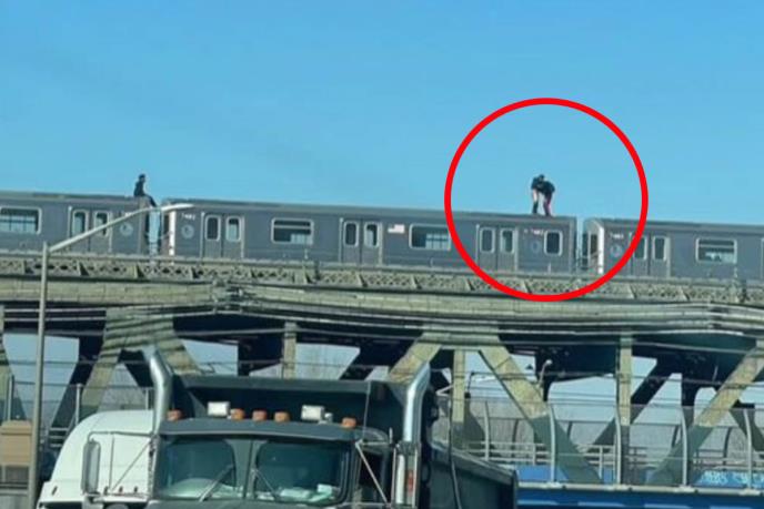 Na nesvakidašnjim fotografijama, koje su navodno nastale prošlog petka u Nujorku, vide se dvojica muškaraca sa spuštenim pantalonama na krovu metroa koji prolazi preko nadvožnjaka na auto-putu Van Vik.