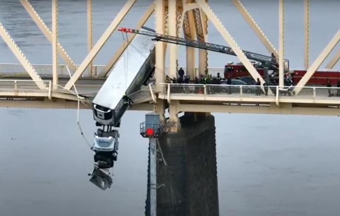 Kamion je prelazio Кlarkov most iznad preko reke Ohajo kad je iznenada promenio traku i probio barijeru. Na dramatičnim snimcima se vidi da je veći deo kamiona visio preko ograde.