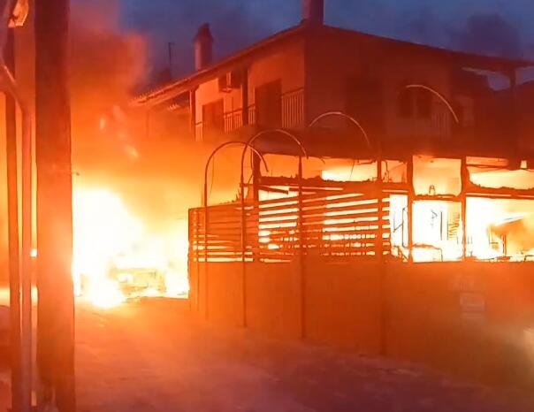 Požar je zahvatio jedan kafić na šetalištu u Pefkohoriju, a kako se vidi na snimku, vatra je progutala skoro ceo objekat.