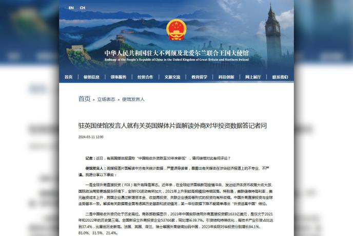 Portparol kineske ambasade u Velikoj Britaniji u ponedeljak je opovrgao medijske izveštaje "pojedinih britanskih medija" o stranim investicijama u Kini, nazivajući ih "pristrasnim i da im nedostaje profesionalnosti i preciznosti".