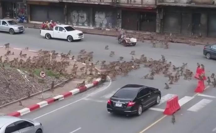 Na snimku se vide dva policajca kako se voze oko Lopburija na motociklu, a jedan od njih puca praćkom i baca kamenčiće na 'opasne' primate.