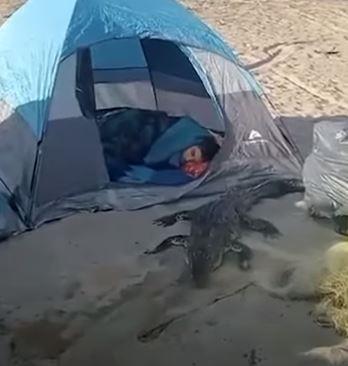Zastrašujuća scena prikazuje mladog turistu koji spava u šatoru, a pored njegove glave vidimo krokodila!
