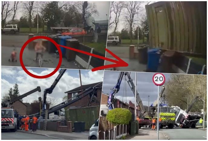 Britanski mediji objavili su dramatičan snimak iz grada Vigana na kojem je prikazano kako se devojčica, koja je vozila bicikl u dvorištu, u poslednjem trenutku uspela da pobegne na bezbedno pre nego što se na prednji deo kuće srušio kran s ogromnim metalnim kontejnerom.