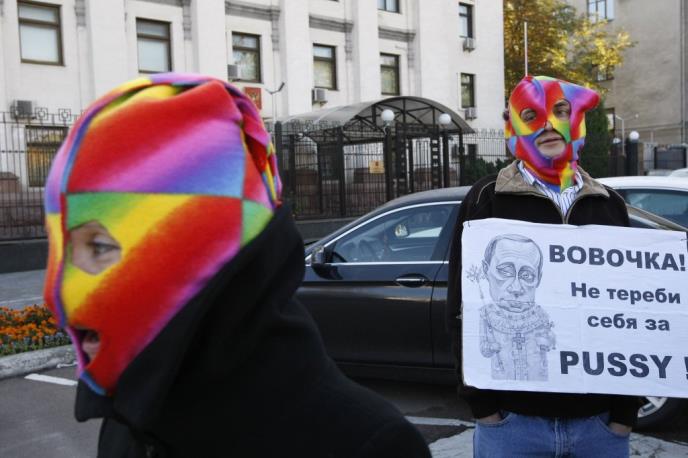 Protivnici su pred zgradu suda doneli gumene ženske lutke protestujući protiv organizacija koje provokatorke iz Pusi rajota predlažu za ugledne nagrade