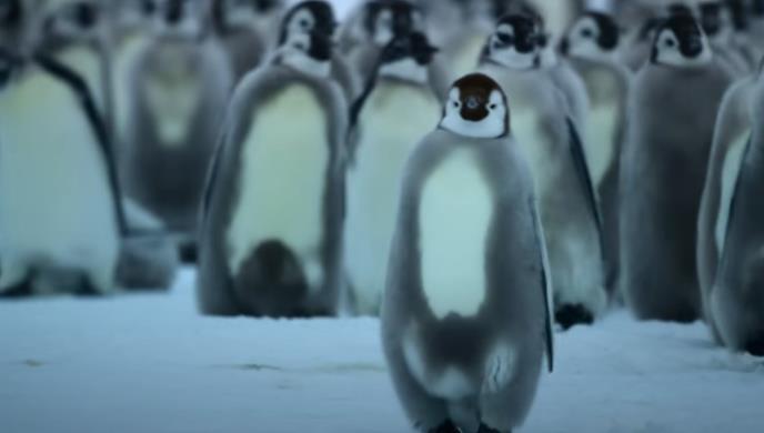 Dronom je snimio prizor u kojem pingvini stoje na ivici litice i gledaju dole u okean. Napokon je jedan neustrašivi pingvin preuzeo kontrolu i hrabro skočio u vodu.