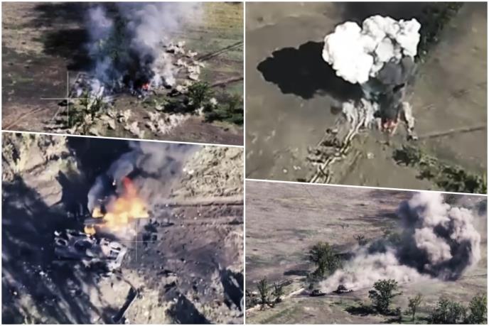 Na snimku se vidi kako se kolona predvođena tenkovima odjednom našla pod artiljerijskom vatrom na zemljanom putu. Vojnici su istrčavali iz pogođenih oklopnih vozila tražeći spas dok su dronovi kamikaze naletali na oštećene tenkove.