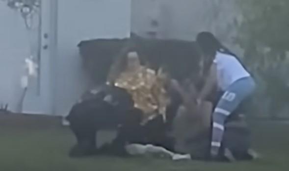 Na lice mesta ubrzo su stigli policajci i ekipa Hitne pomoći, a na snimku se vidi kako zamenik šerifa Kristofer Bruns izlazi iz patrolnih kola i trči prema dvorištu.
