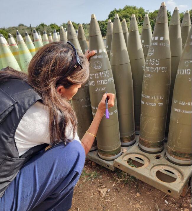 Tokom posete izraelskoj severnoj granici, bivša kandidatkinja za republikansku predsedničku nominaciju Niki Hejli, potpisala se na artiljerijsku raketu namenjenu Gazi i napisala ''Dokrajčite ih! Amerika voli Izrael''.