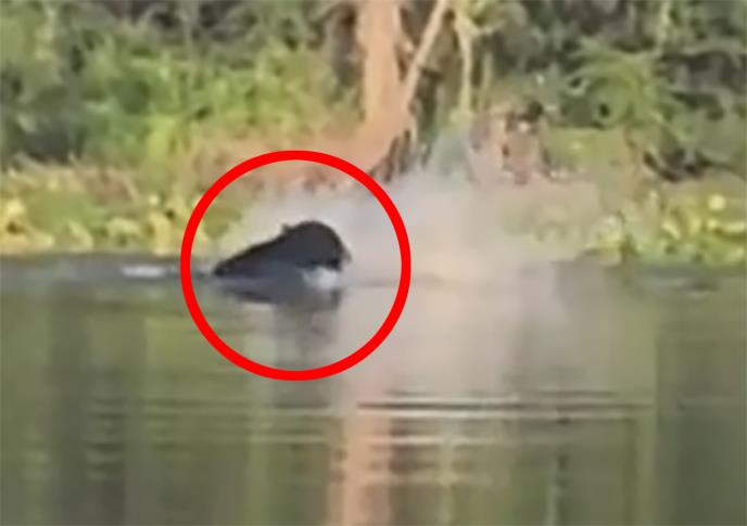 Na početku snimka vidi se kako medved i aligator plivaju jedan prema drugom. Dve životinje se sudaraju, a medved, naizgled bez napora, skače na aligatora i potom nastavlja da pliva dok gmizavac kreće za njim.