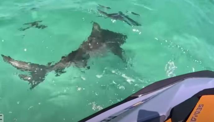 Lokalni broker Endrju Kejdi objavio je snimak na kome se vidi kako agresivna bik ajkula naleće na džet skije u kristalno čistim vodama Grejton Biča u okrugu Volton na Floridi. Ajkula pliva nedaleko od džet skija nakon čega se iznenada okreće i naleće na plovilo.