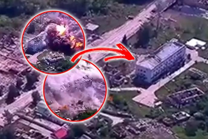 Monstruozna bomba, teška 3.000 kilograma, bačena je navodno u četvrtak na trospratnicu u selu Lipci u Harkovskoj oblasti koja je korišćena za privremeni smeštaj pripadnika Oružanih snaga Ukrajine. Na snimku se vidi kako bomba pada nedaleko od zgrade nakon čega je nastala užasavajuća eksplozija koja je raznela sve manje objekte u okolini.