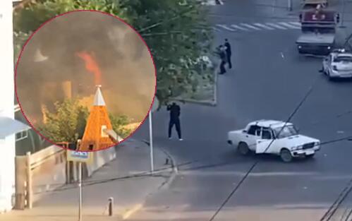 Na snimcima iz Derbenta vidi se grupa napadača koja sa puškama u rukama šeta pored crkve i puca na policiju. Na drugom snimku vidi se sinagoga koja je u plamenu.